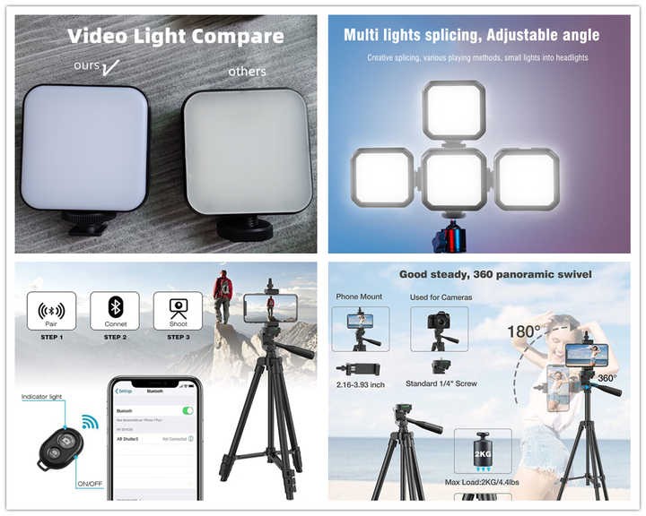 Package includeremote control,tripod, LED light, phone clip,micphone,portable bag, microphone cable